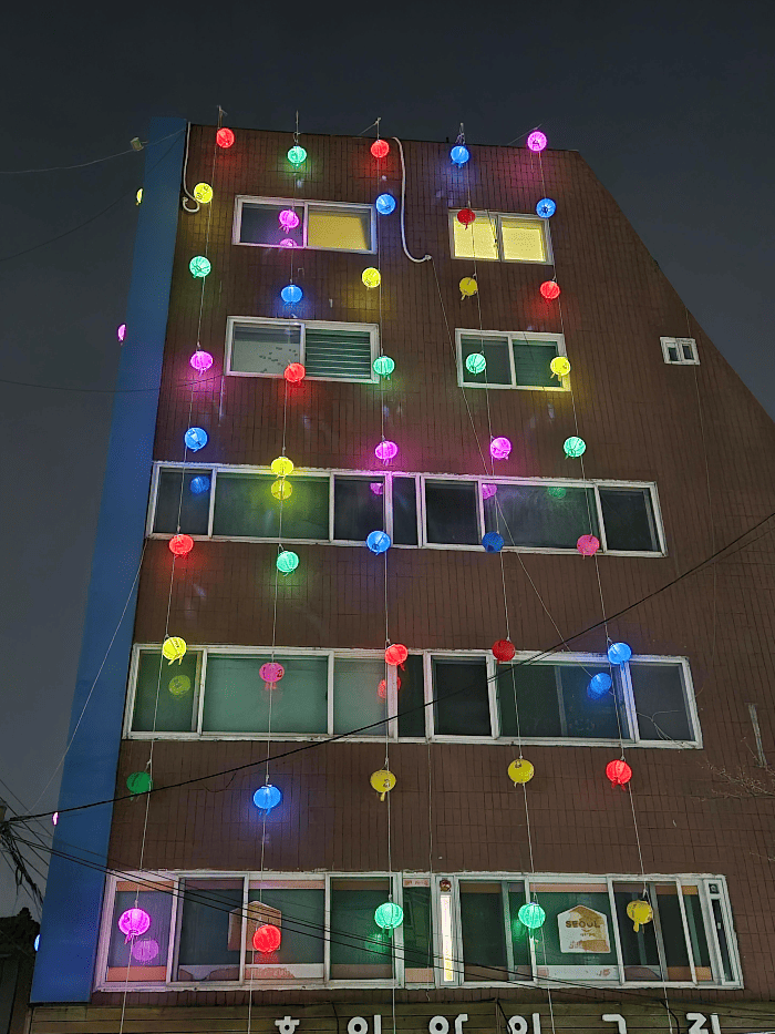 불 꺼진 건물의 외벽을 따라, 일정한 간격으로 늘어선 연등들이 하나둘 불을 밝히고 있었다. 그 작은 불빛들이 어두운 거리를 천천히 감싸며, 공간 전체의 분위기를 바꾸어 놓았다.