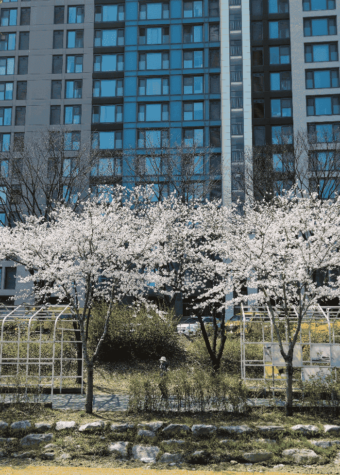 저 멀리 아파트 외벽과 나란히 어우러지며