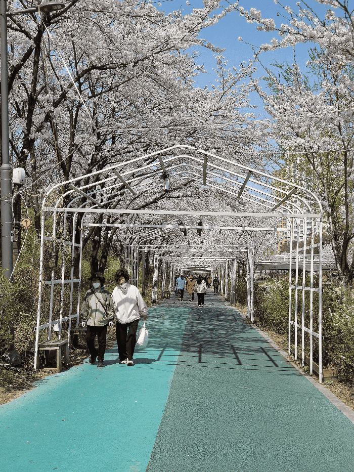 하얀 아치형 구조물 위로 빼곡히 덮인 벚꽃들.