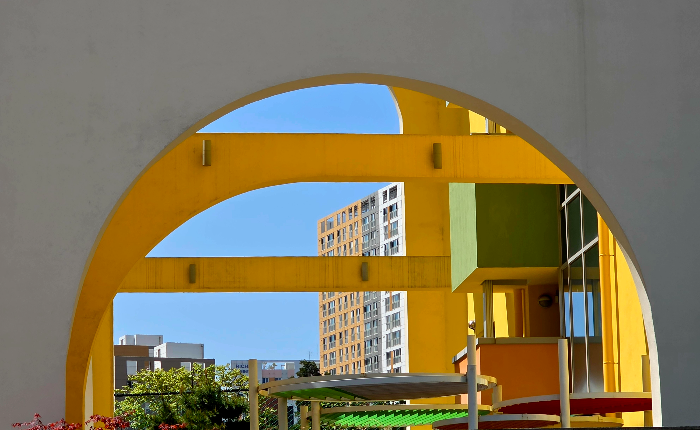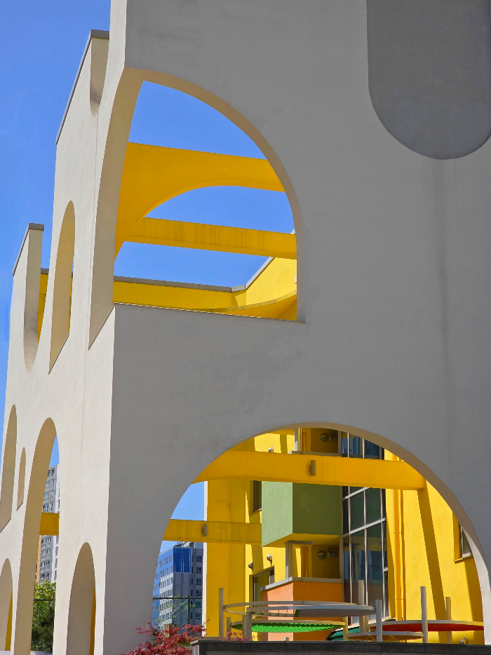 노란 구조물이 리듬감 있는 선을 만들며
