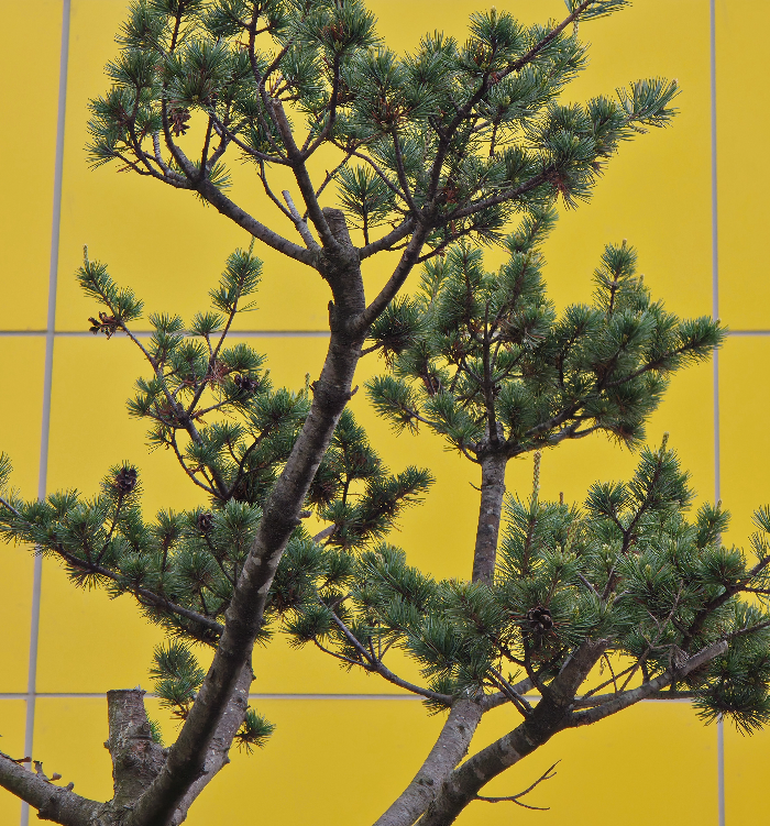 아직 봄기운을 다 입지 못한 소나무가 서 있다.