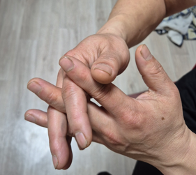 - 손등과 손바닥을 손가락으로 눌러주듯 주무릅니다.
