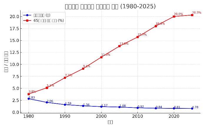 반면, 65세 이상 인구 비중은 이미 **20%**를 넘었으며, 통계청은 2035년에는 **노인 부양비(생산연령 100명당 노인 수)**가 50명에 이를 것으로 예측한다.