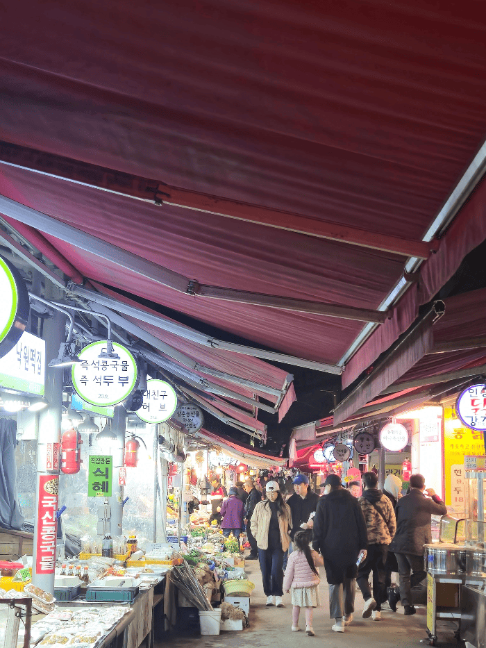 포인트: 음식을 클로즈업하기보단 시장 전체 풍경을 찍는 구도가 더 자연스럽고 스토리감 있음